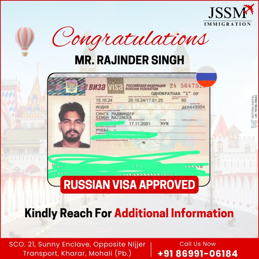 This image is another congratulatory announcement from JSSM Immigration regarding the successful approval of a Russian visa for “Mr. Rajinder Singh.”