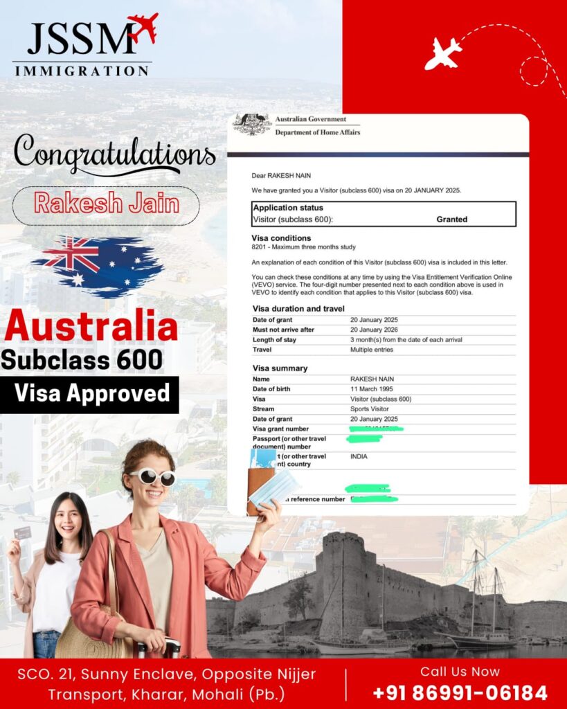 JSSM Immigration extends heartfelt congratulations to Rakesh Jain on successfully obtaining his Australia Subclass 600 Visitor Visa. Granted by the Australian Government’s Department of Home Affairs on January 20, 2025, this visa permits multiple entries with a maximum stay of three months per visit. This achievement highlights JSSM Immigration’s expertise in visa consultation and seamless processing. If you’re planning to visit Australia, JSSM Immigration is here to guide you through the process. Visit us at SCO. 21, Sunny Enclave, Opposite Nijjer Transport, Kharar, Mohali, or call +91 86991-06184 for expert assistance.