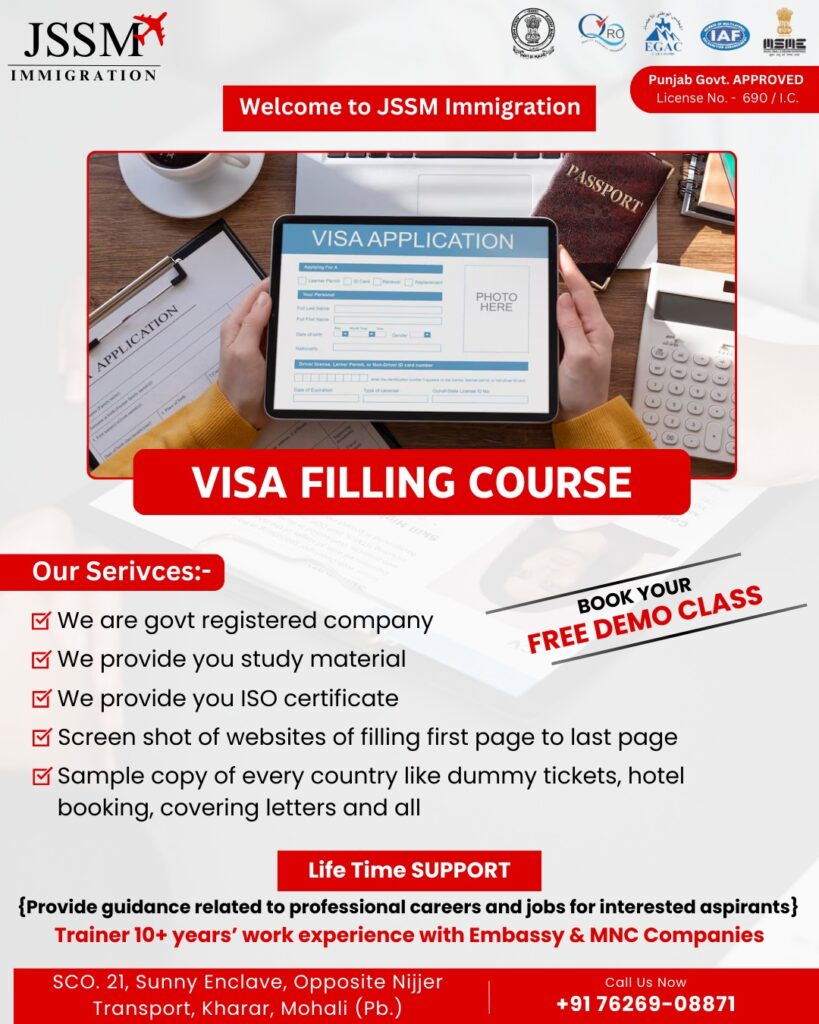 This promotional image from JSSM Immigration highlights their Visa Filling Course, designed to provide comprehensive guidance on visa application procedures. The banner emphasizes that JSSM Immigration is a Punjab Government-approved and registered company, ensuring credibility and trustworthiness. The course offers study materials, ISO certification, and step-by-step guidance on filling out visa applications, including screenshots of the entire process. Participants will also receive sample documents, such as dummy tickets, hotel bookings, and covering letters for various countries.